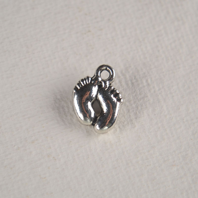 Deze zilverkleurige metalen bedel met babyvoetjes is een klein maar betekenisvol detail voor creatieve projecten rondom geboorte en nieuw leven. Door het subtiele formaat en het herkenbare symbool is deze bedel perfect om een persoonlijk accent toe te voegen aan een handgemaakt item.