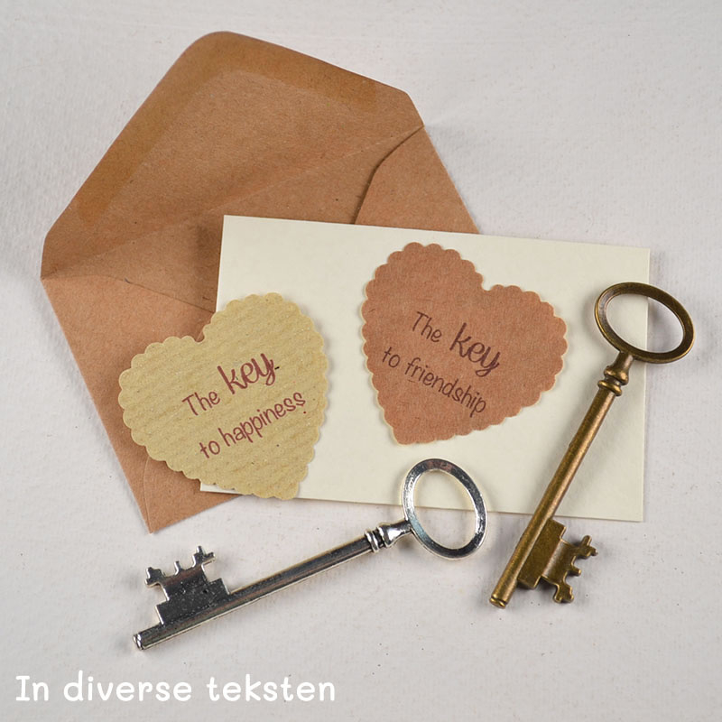 Een klein cadeautje met een mooie betekenis. Dit setje bestaat uit een ronde sleutel, een hartsticker met tekst naar keuze en een envelopje in een kleur naar keuze. Leuk als symbolisch gebaar bij een nieuw huis, een nieuwe stap, vriendschap of gewoon als lieve verrassing.