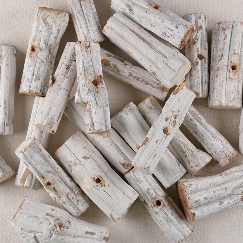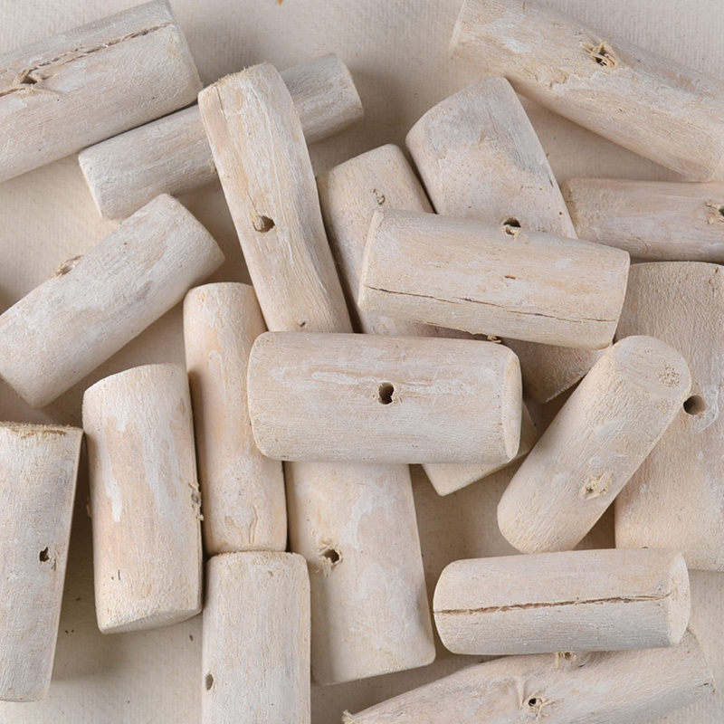 Houten Kraal Wit Langwerpig - drijfhoutLangwerpige houten kraal met witte, rustieke uitstraling en boorgat. Mooi voor een zeepketting, hanger, slinger of ander creatief project met een natuurlijke sfeer.