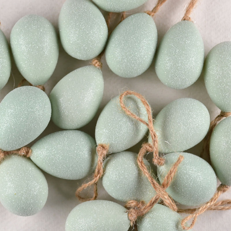 Kunststof Paasei met Glitter MintgroenLicht kunststof paasei in een zachte mintgroene tint, afgewerkt met fijne glitter en een jute touwtje om het direct op te hangen. Mooi als paasdecoratie in een tak, aan een cadeautje of als fris detail in een lentehoekje.