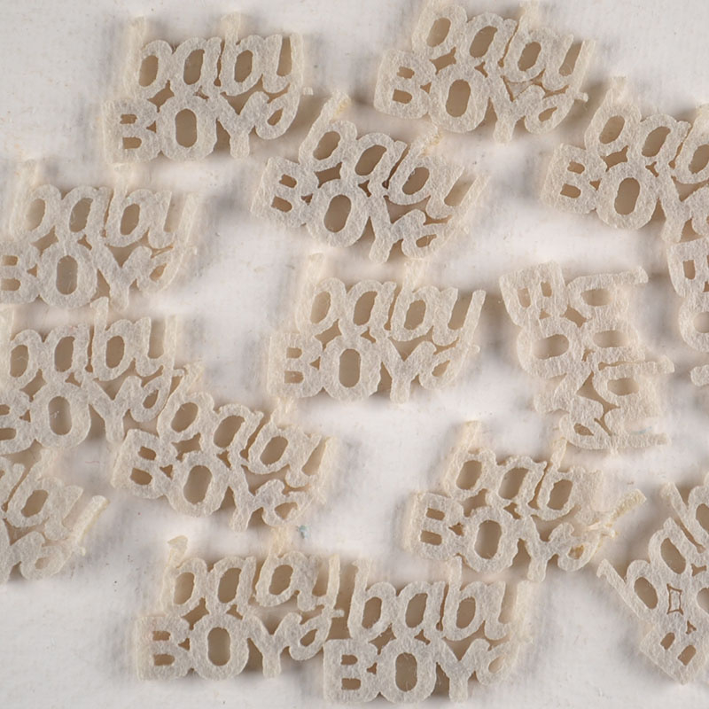Vilt Figuurtje – Baby Boy TekstKlein vilt figuurtje met de tekst baby boy in een zachte beige tint. Licht van gewicht en fijn om toe te voegen aan kaartjes, labels of kleine kraamcadeautjes.