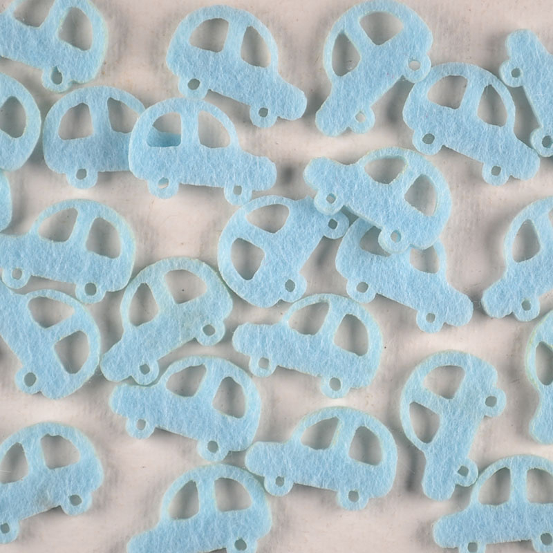 Vilt Figuurtje – AutoLichtblauw vilt figuurtje in de vorm van een auto, eenvoudig en herkenbaar.