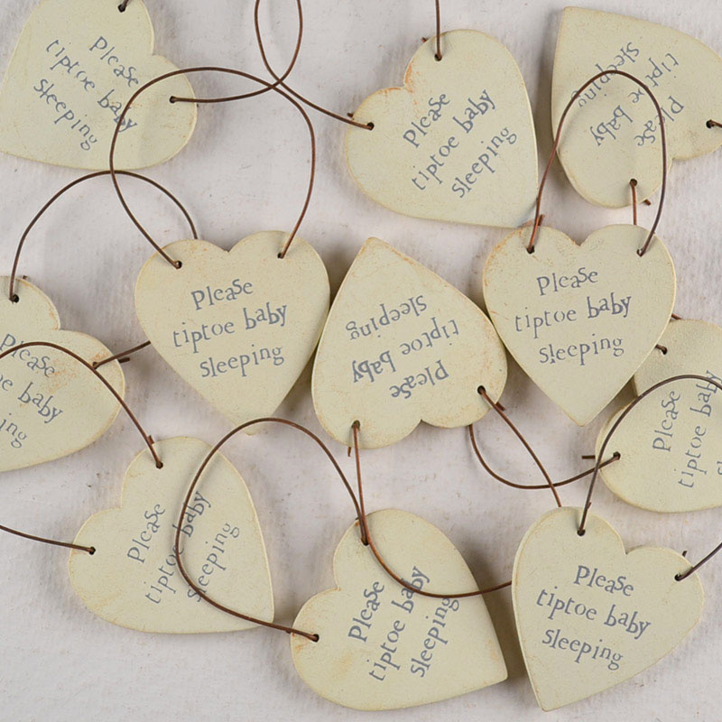 Houten Hart Tag - Baby SleepingDeze houten hart-tag met de tekst Please tiptoe baby sleeping is een lief en subtiel detail voor een babykamer of kraamcadeautje. De zachte kleur en het fijne formaat geven het een rustige, warme uitstraling.
