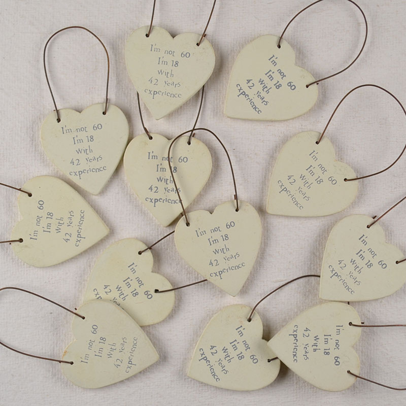 Houten Hart Tag - I'm Not 60Houten hart tag met een speelse tekst I’m not 60, I’m 18 with 42 years experience, leuk als grappig detail bij een verjaardagscadeautje.