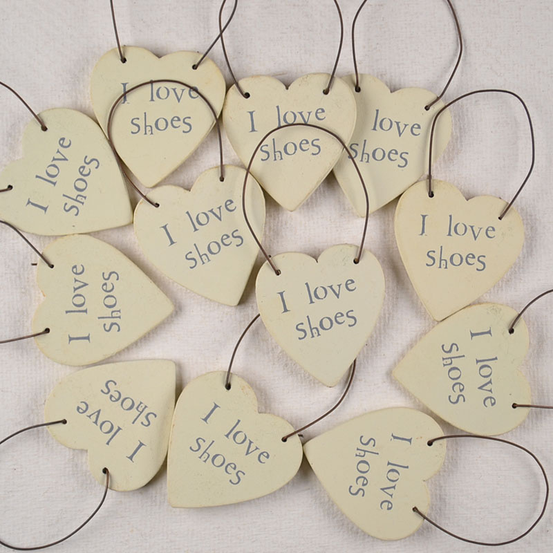Houten Hart Tag - I love shoesDeze houten hart tag met de tekst I love shoes is een speels en origineel detail voor een cadeautje met een knipoog. Klein, maar met een leuke boodschap die meteen opvalt.