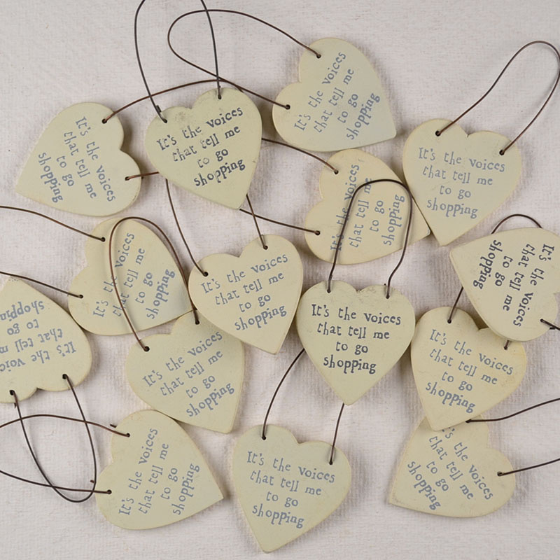 Houten Hart Tag - ShoppingDeze houten hart tag met de tekst It’s the voices that tell me to go shopping zorgt voor een vrolijke knipoog. Een klein detail met humor dat een cadeautje net wat speelser maakt.
