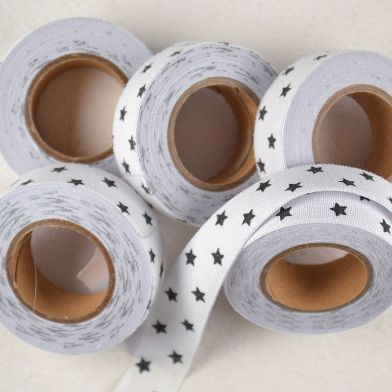 Stoffen Tape Sterren Zwart WitStoffen tape met zwart sterrenpatroon op witte basis. Stoer en speels tegelijk. Zelfklevend en goed te gebruiken voor labels, kaartjes en verpakkingen met een grafisch accent.