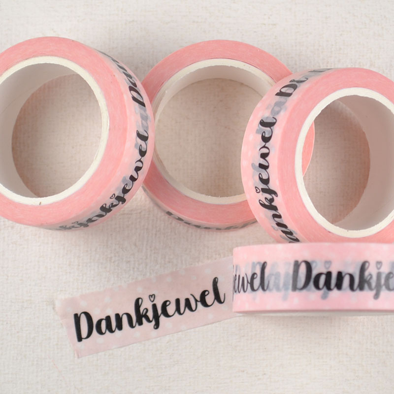 Washi Tape Zacht Roze met DankjewelZacht roze washi tape met “Dankjewel” tekst. Ideaal voor bedankjes, traktaties en kleine cadeautjes. Geeft je verpakking meteen een persoonlijke boodschap mee.