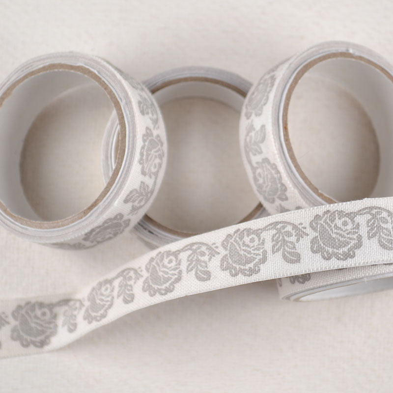 Stoffen Tape Wit met Rozenprint GrijsDecoratieve stoffen tape in wit met grijze rozenprint. Een klassiek bloemmotief met zachte uitstraling. Mooi voor cadeautjes, bedankjes en creatieve afwerking van verpakkingen.
